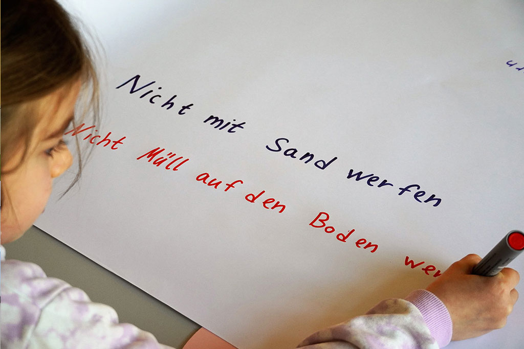 Freudig unterschreibt die Zweitklässlerin in einem roten Fußabdruck aus Papier.