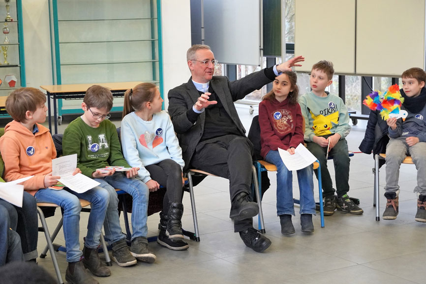 Der silberne Bischofsring hat es den Drittklässlern besonders angetan. Andächtig wandert er im Stuhlkreis von Hand zu Hand, wird befühlt und interpretiert. „Das ist ja Jesus, der da sitzt“, platzt es aus Jonathan heraus. Und Erzbischof Stefan Heße nutzt die Gelegenheit seines Besuches an der Katholischen Schule Bergedorf, um mit der künstlerischen Darstellung auf dem Ring auf Jesus zu sprechen zu kommen – und zugleich die Aufgaben eines Oberhirten im Erzbistum Hamburg zu erklären. „Hast Du auch eine Kette mit einem Kreuz?“, hakt Carla nach. „Ja, aber das trage ich eigentlich nur bei feierlichen Anlässen“, gesteht Hamburgs Oberhirte.