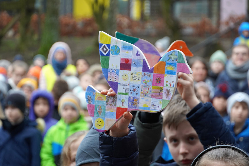In Gesprächen mit der Schulleitung und dem Kollegium der Katholischen Schule Bergedorf geht es dann anschließend durchaus differenzierter zu. Erzbischof Heße nutzt den Austausch, um sich u.a. über die Folgen der Corona-Pandemie, über Spracherwerb, digitale Unterrichtsgestaltung und neue pädagogische Ansätze zu informieren. Gemeinsam mit Schulabteilungsleiter Dr. Christopher Haep und Schulleiterin Christiane Roling nimmt er zudem die weitere Schulentwicklung und die anstehende Sanierungs- und Neubauplanung in den Blick. Zum Abschluss seines Besuches trifft Erzbischof Heße schließlich noch die Klassensprecher der dritten und vierten Jahrgänge sowie die Friedensbotschafter, ehe er von Schülern gestaltete Friedenstauben auf dem Pausenhof im Beisammensein der gesamten Schulgemeinschaft segnet. „Es war richtig schön hier bei Euch“, dankt Heße den Kindern. „Dürfen wir dich denn auch mal besuchen?“, fragt Matheo spontan. „Klar“, antwortet Hamburgs Oberhirte, „aber sagt mir am besten frühzeitig Bescheid. Ich habe so viele Termine …“. Die nächsten Schulbesuche gehören dazu.