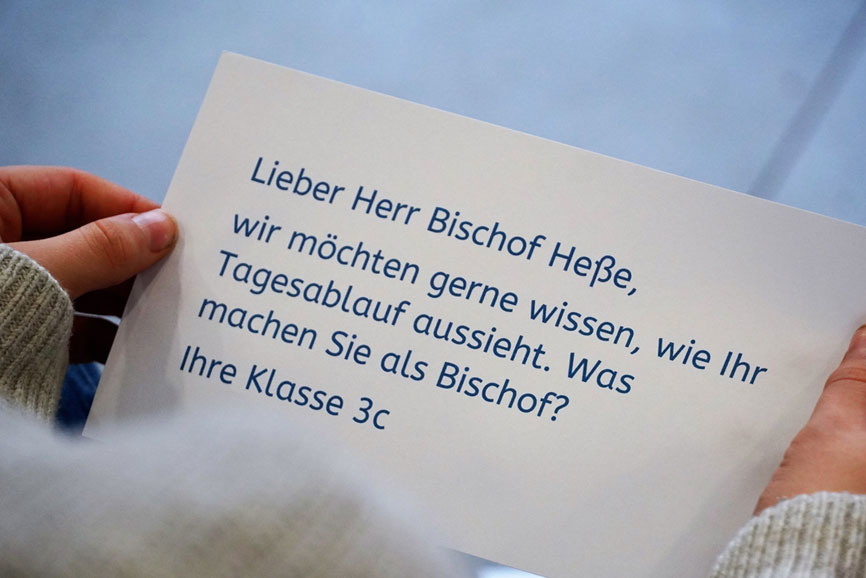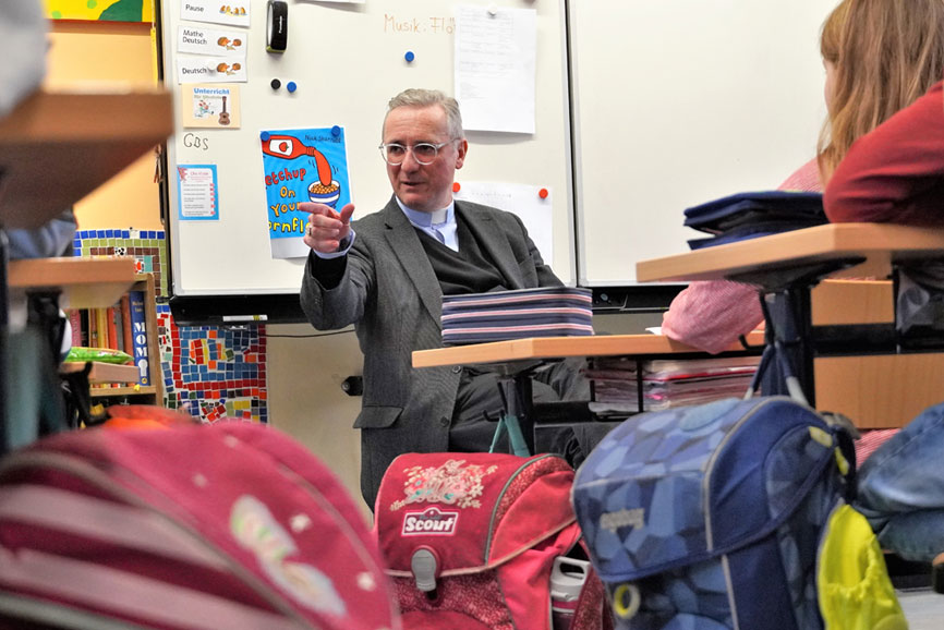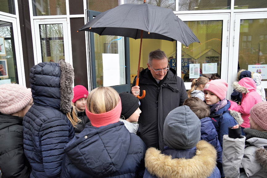 Am Morgen startet die Bergedorfer Visite mit einem Gebet und zahlreichen Fragen im Klassenraum der 3b. Ob es um das Lieblingsschulfach (Geschichte), um Sport („Früher Schwimmen, heute Fahrradfahren“), die Fastenzeit (tägliches Bibellesen) oder die eigene Automarke (Golf) geht – Heße nimmt sich Zeit, um die Fragen der Schülerinnen und Schüler ausführlich zu beantworten. Nur bei der Lieblingsspeise lässt sich der Gast nicht in die Karten schauen. „Das verrate ich grundsätzlich nicht. Denn sonst bekomme ich nachher bei allen Einladungen immer das gleiche Essen“, schmunzelt er. Als Niklas wissen will, ob ihm sein Beruf gefalle, überlegt Erzbischof Heße etwas länger – und gesteht: „Manchmal ist es schon ganz schön anstrengend. Es gibt viele Dinge, die eben nicht einfach zu entscheiden sind. Aber insgesamt kann ich sagen: Ja! Es gibt immer wieder so viele schöne Momente, für die ich sehr dankbar bin“. Beim anschließenden Besuch in der Vorschulklasse blicken Sofia, Leonardo, Maja und ihre Freunde den Erzbischof mit großen Augen an, als würde irgendwas nicht stimmen. „Ich dachte Du siehst alt aus“, bringt es Leonardo schließlich auf den Punkt. Heße muss lachen. Die Geschichten über Bischöfe wie den Heiligen Nikolaus oder Sankt Martin scheinen eindeutige Bilder in den Kinderköpfen hinterlassen zu haben.