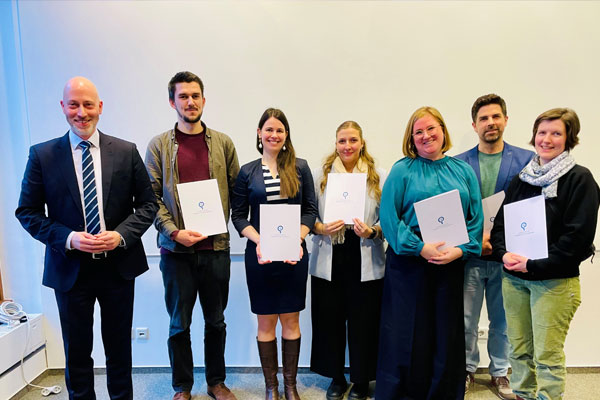 Auf dem Foto sind von links nach rechts zu sehen: Dr. Christopher Haep (Leiter der Schulabteilung), eine Lehrkraft der Sophie-Barat-Schule, Delia Moritz (Sophie-Barat-Schule), Melina Ihde (Katholische Bonifatiusschule), Charlotte Riepe (Katholische Schule St. Paulus), Tim Berendonk (Sophie-Barat-Schule) sowie Katharina von Huene (Sankt-Ansgar-Schule)