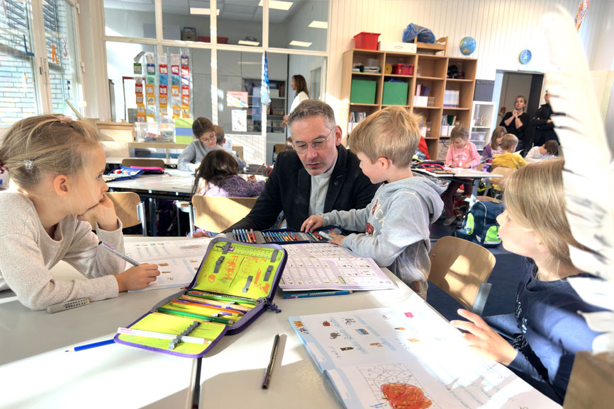 Bei einem Rundgang durch die Schule und abwechslungsreichen Unterrichtseinblicken nahm Geißler wichtige Eindrücke aus dem Schulleben mit. Und genau das ist der Sinn der regelmäßigen Schulbesuche, die der Generalvikar sowie Erzbischof Stefan Heße mehrfach im Jahr vorsehen: ins Gespräch kommen, den Austausch suchen und immer wieder neu einen Blick auf das Alltagsgeschehen an diesen wichtigen Orten kirchlichen Lebens werfen. Und so nahm sich Pater Geißler nicht nur viel Zeit für die Jüngsten, sondern suchte vor allem auch das Gespräch mit dem Kollegium, mit GBS-Leitung, Schulpastoral sowie Elternvertretern. Dabei standen auch die sich verändernden pastoralen Konzepte und -strukturen sowie die Zusammenarbeit zwischen Gemeinde und Schule im Vordergrund des Austausches. „Unsere Kirche tut in Schule etwas ganz Wesentliches für die Gesellschaft“, erklärte Geißler. Deswegen sei es von elementarer Bedeutung, dass sich die unterschiedlichen kirchlichen Kooperationspartner gut vernetzen. „Wenn Eltern hier in der Schule eine gute Erfahrung mit Kirche machen – dann haben wir vieles richtig gemacht“, erklärte der Generalvikar – mit Blick auf Langenhorn und 15 weitere Schulsandorte in der Hansestadt.