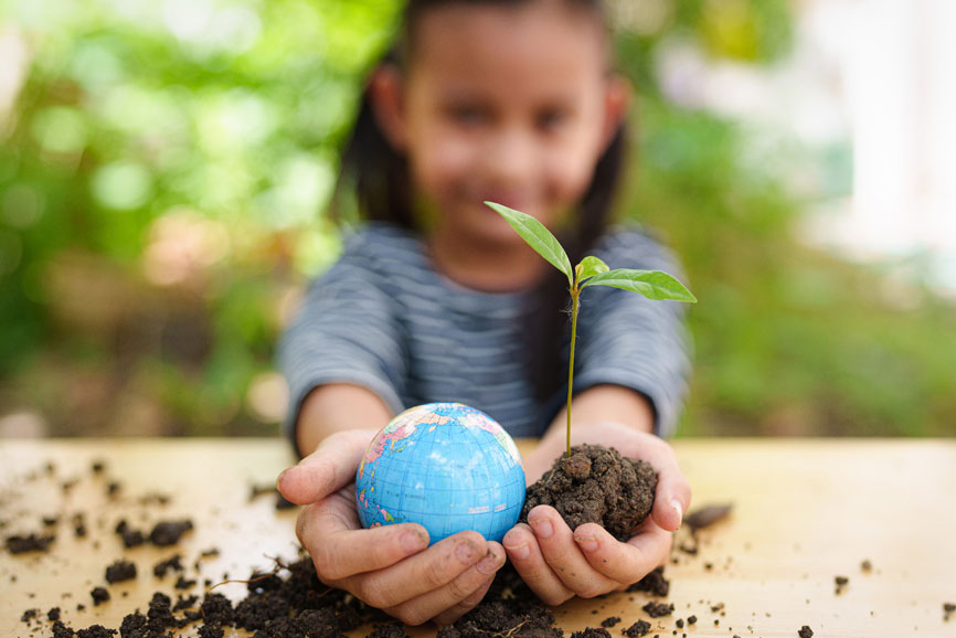 Hier ist ein Mädchen zu sehen , welches in der einen Hand einen Ball als Weltkugel und in der anderen Hand eine kleine grüne Pflanze mit Erde. Dies ist ein Beispielbild für das Rahmenleitbild für Umwelt, Ökologie und Nachhaltigkeit