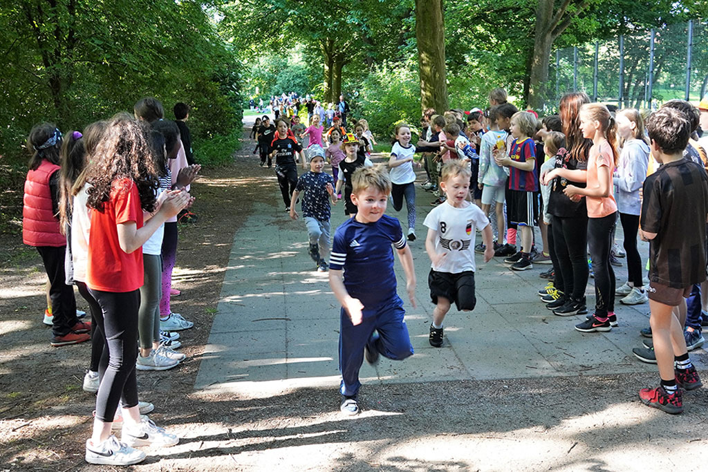 „VSB, VSB!“ – durch ein Spalier stimmlich kraftvoller Viertklässler bahnen sich Kira und ihre Freundinnen der Katholischen Sophienschule den Weg zu ihrem Startplatz.