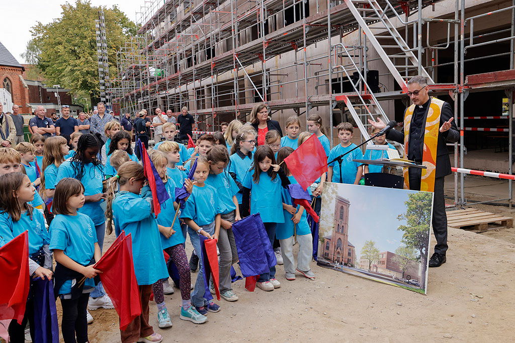 Richtfest für eines der großen Schulentwicklungsprojekte des Erzbistums Hamburg in der Hansestadt: In unmittelbarer Nachbarschaft zum Barmbeker Mesterkamp-Quartier feierten Generalvikar Pater Sascha-Philipp Geißler und die Schulgemeinschaft mit 250 Gästen, Unterstützern und Kooperationspartnern einen wichtigen Meilenstein auf dem Weg zur Fertigstellung des 25 Millionen Euro teuren Schulneubaus. Die moderne dreizügige Vor- und Grundschule mit Kita, Mensa, grünem Klassenzimmer und eigener Sporthalle soll im ersten Halbjahr des Schuljahres 2025/26 bezugsfertig sein. Zukünftig werden 360 Kinder die Vor- und Grundschuljahrgänge besuchen können. „Mit dem Richtfest starten wir sozusagen in die heiße Phase dieses wichtigen Zukunftsprojektes“, erklärte Geißler.