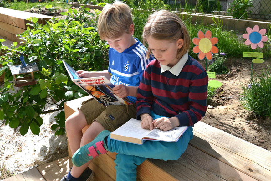 „Unser Ziel ist es, den Kindern ein anregendes Lernumfeld zu bieten, das ihre persönliche Entwicklung stärkt“, verdeutlicht Schulleiterin Eike Eichmann die Idee. Der Lesegarten ergänze das umweltpädagogische Konzept der Schule durch kreative Leseförderung und ermögliche den Schülerinnen und Schülern, die Natur intensiver kennen und lieben zu lernen. Unterstützt wurde die Gestaltung des terrassenförmig angelegten Grundstücks an der Südseite der Schule mit 5.000 Euro durch die Norddeutsche Stiftung Umwelt und Entwicklung (NUE) sowie mit 9.400 Euro durch die Bezirksversammlung Altona. Es umfasst rund 30 Sitzplätze auf eingelassenen Naturholzbalken, Apfelbäume, Kräuterbeete und Beerenbüsche, die es einer ganzen Klasse ermöglichen, gemeinsam in der Natur zu lesen. Zusätzlich sollen die Kinder durch die Pflege und Versorgung der Pflanzen wichtige ökologische Zusammenhänge verstehen lernen. „Ihr Konzept des ‚ganzheitlichen Erlebens‘ hier in Maria Grün wird immer deutlicher und umfassender erkennbar“, erklärte Schulabteilungsleiter Dr. Christopher Haep bei der Eröffnung und ergänzte: „Möge dieser Lesegarten – gemeinsam mit der Hühnerhaltung auf dem Pausenhof, der Tierversorgung durch die Schülerinnen und Schüler, dem regelmäßigen Pflanzen und Jäten in den Beeten – ein Ort der Inspiration und des naturnahen Lernens sein, der viele Generationen von Schülerinnen und Schülern bereichert.“ Der Lesegarten sei beispielgebend für andere Schulstandorte und zeige, dass mit Kreativität ungenutzte Grundstückswinkel eine wichtige neue Bedeutung erhalten können.